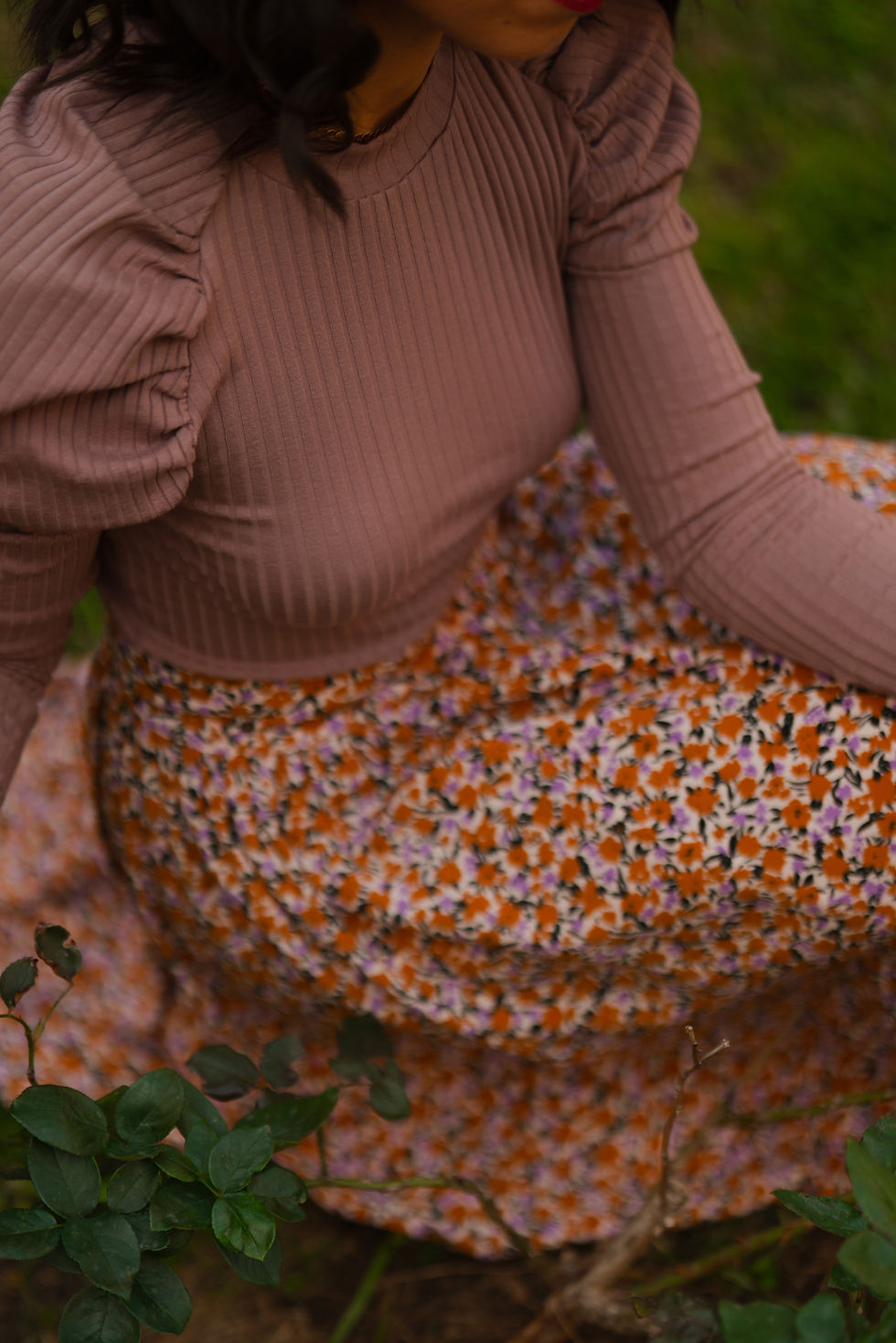 Gonna lunghezza maxi in viscosa naturale stampata, vita con cinturino alto e bottoncini ricoperti sul retro, taglio a teli con arricciatura in vita e cerniera invisibile.